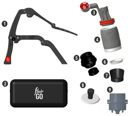 Incluso con tutti i Flair 2GO 1. Corpo pieghevole Flair 2GO 2. Flair 2GO Custodia per il trasporto 3. Pistone con manometro 4. Cilindro di infusione senza preriscaldamento Incluso con il modello Grounds 5. Portafiltro 2 in 1 senza fondo 6. Stainless steel dispersion screen ( trovato all'interno del cilindro di fermentazione ) 7. Imbuto dosatore 8. Flair 2GO Manomissione Incluso con il modello Pods 9. Portafiltro per cialde |  |