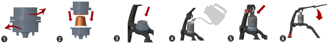 7. ATTENZIONE: l'interno del Pod Portafilter è tagliente - 8. Non rilasciare mai la leva bruscamente! L'acqua bollente potrebbe SCHIZZARE!