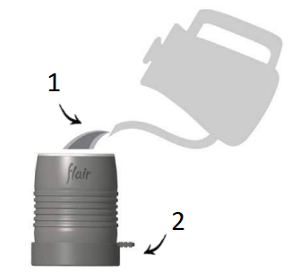 Il tuo Flair 2GO non necessita di preriscaldamento per ottenere una buona estrazione dell'espresso. Tuttavia, se si desidera una tostatura leggera o un'erogazione più calda, è possibile preriscaldare il cilindro. Consigliamo due metodi. - Posiziona il cilindro in posizione verticale in una ciotola o nel lavandino e riempilo con acqua bollente. Lascialo riposare per 30 secondi. Rimuovilo con cautela.