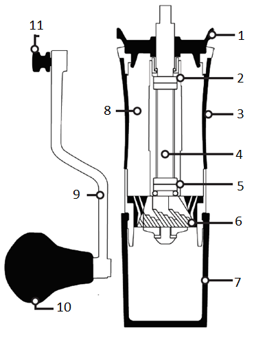 Il macinino è composto da tre parti principali: (A) maniglia in alluminio rimovibile, (B)