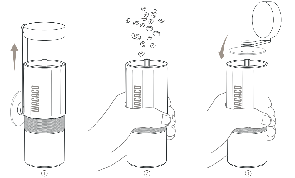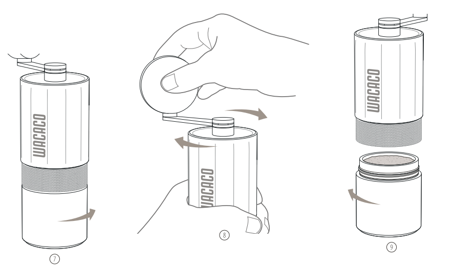 8. Tenere il corpo principale in una mano e ruotare la maniglia in senso orario con l'altra mano fino a quando tutti i chicchi non saranno macinati.