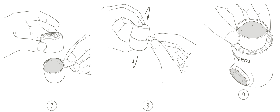 - Pressare delicatamente il caffè macinato nel filtro con la parte posteriore del misurino.