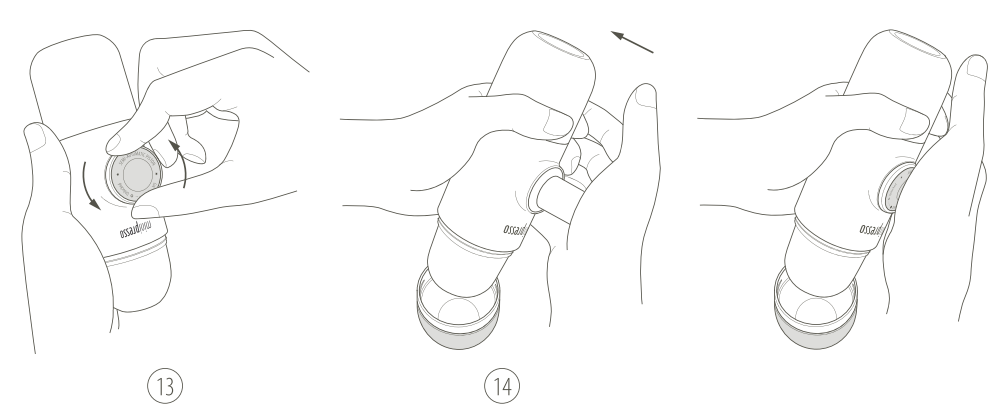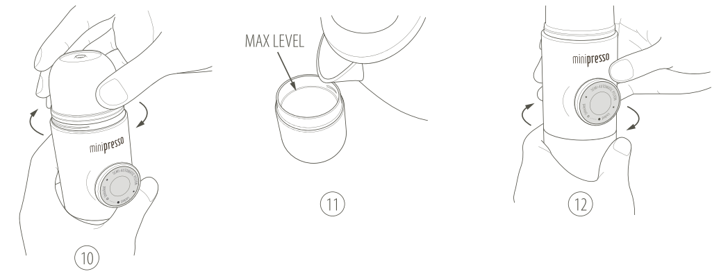 12. Avvitare saldamente il corpo principale sul serbatoio dell'acqua fino all'arresto. Evitare scottature. Maneggiare con cura.